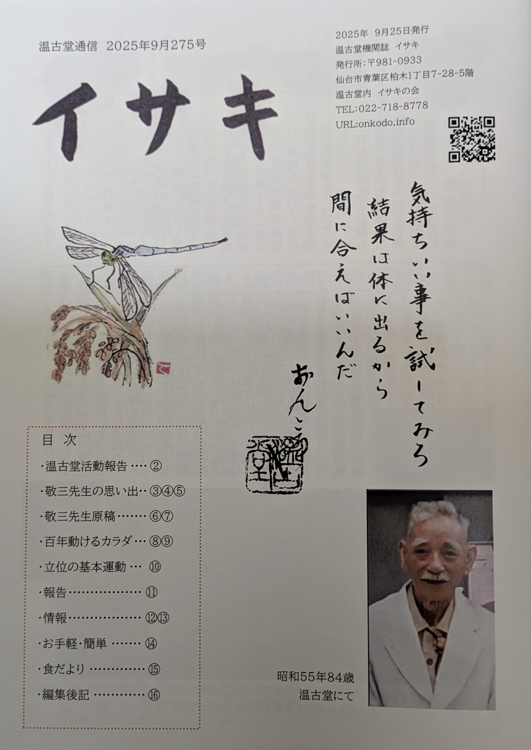 全国のイサキ読者の皆さん、本日9月号を発送しました。今回も盛りだくさんの内容です。敬三先生の書かれた原稿は勿論ですが、敬三先生と出会った人達による先生の紹介や逸話もイサキだからこそ読める話です。それ以外にも、生活にいかせる色々な話題を掲載しています。