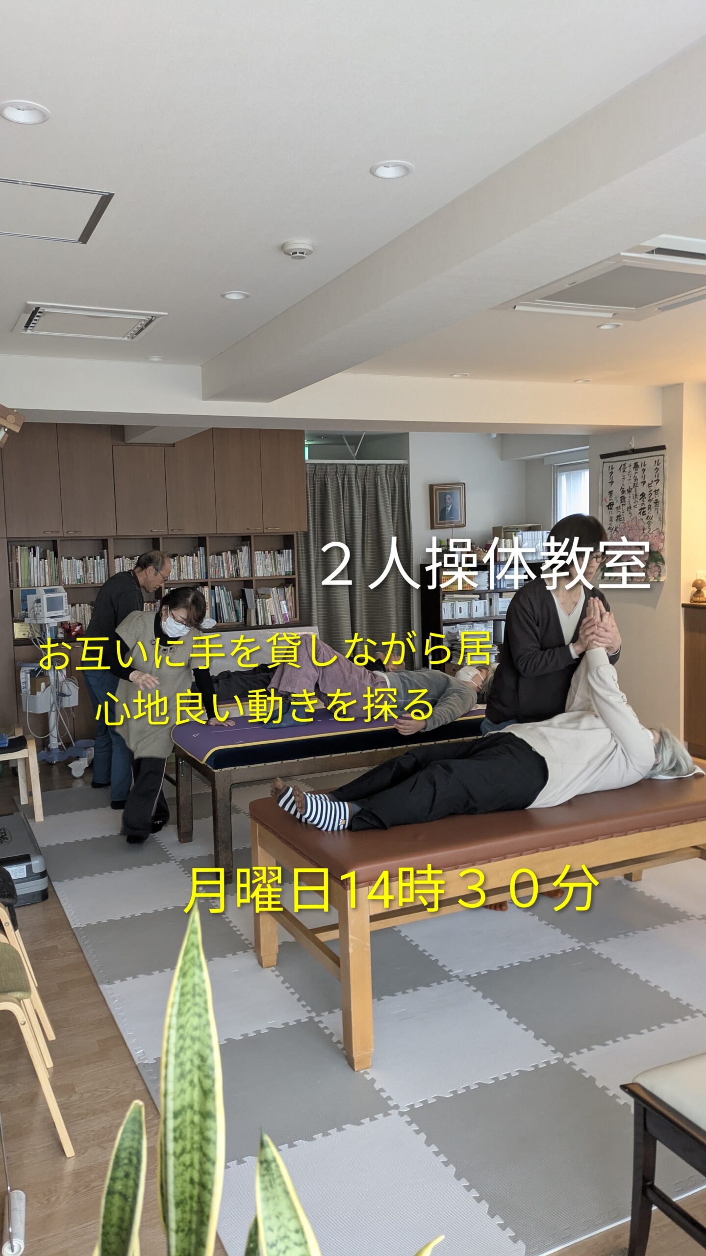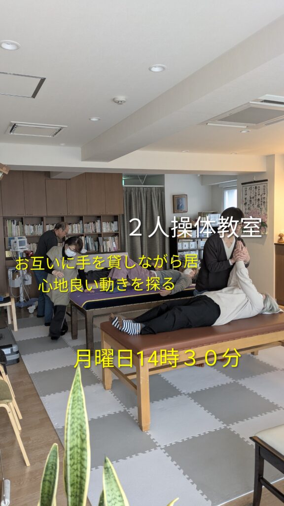 月曜日14時30分からの教室は2人組んでの操体法を行います。1人で実践するのとはまた一味違う操体法の体験が出来ます。自分の感覚を磨くためにも、また体の使い方を体感するにも有効な時間です。