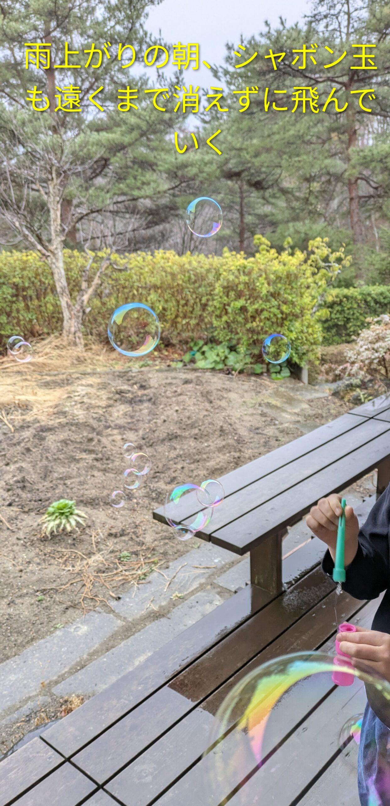 日の出も大分早くなってきました。少し早起きになった孫は、朝からシャボン玉飛ばしに熱中。湿度と微風のお陰でとっても大きなシャボン玉になって遠くまで消えずに飛んでいきました。